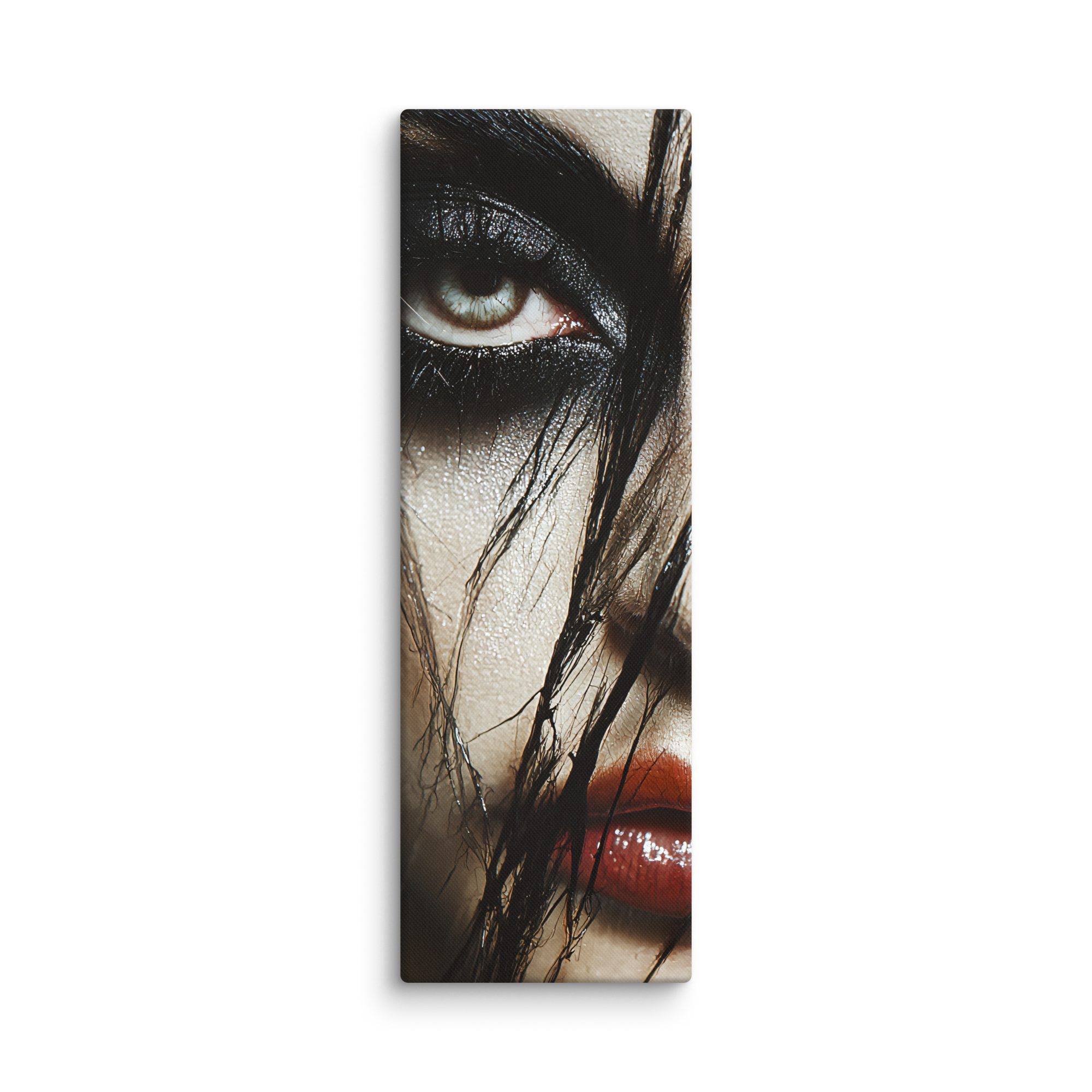 A haunting canvas print of a striking figure cloaked in shadowy elegance, exuding mystery against a dark, evocative backdrop. Printed on 1.25″ thick poly-cotton canvas, hand-stretched over wooden bars with mounting brackets, this fade-resistant piece adds enigmatic allure to any space. Made on-demand for sustainability, it’s a captivating artistic statement.