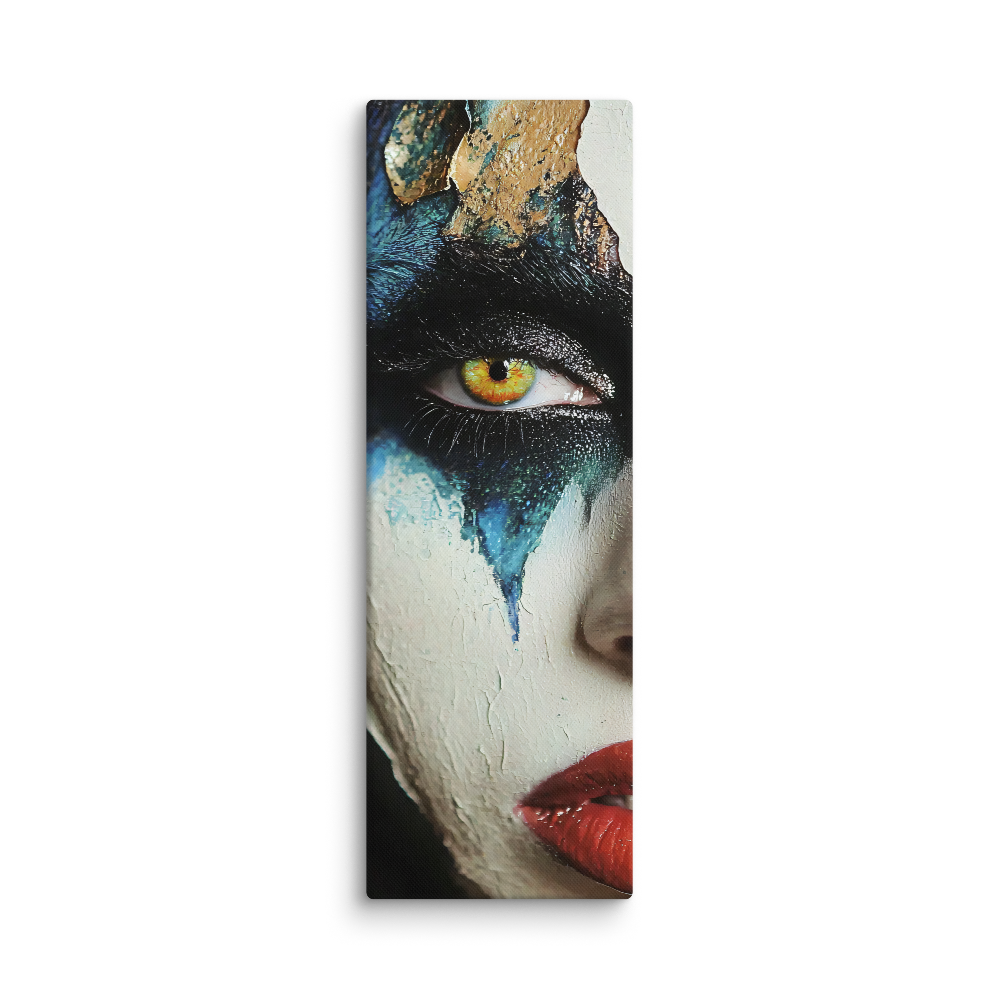 A captivating canvas print of a striking figure exuding enigmatic allure, set against a shadowy, evocative backdrop. Printed on 1.25″ thick poly-cotton canvas, hand-stretched over wooden bars with mounting brackets, this fade-resistant piece infuses any space with mysterious elegance. Made on-demand for sustainability, it’s a mesmerizing artistic statement.